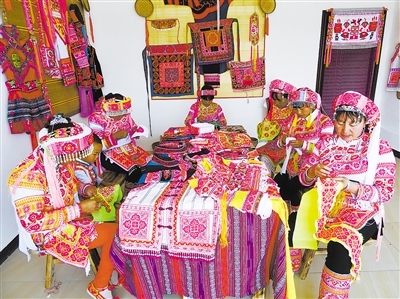 近年来,麒麟区东山镇着力培育民族特色刺绣产业,全力打造“东山绣”品牌,挖掘包装推介了一批刺绣产品,有效带动一大批农村妇女创收。目前,该镇有刺绣技艺较好的绣女230余名,建起刺绣基地,开发了20多个刺绣产品,成功在南博会上展出,刺绣产品远销澳大利亚、新西兰、英国等国家。图为卑舍村彝族绣女们在刺绣。(曲靖日报 记者刘成龙)