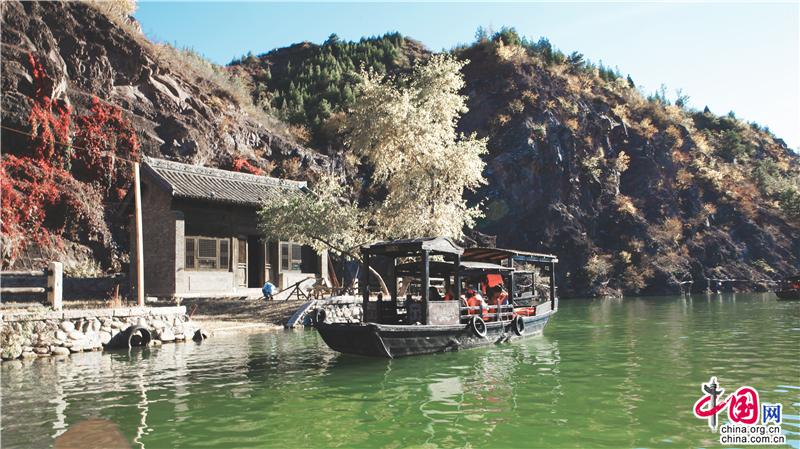 泛舟在汤河上,看红红的五叶地锦,还有暖黄的杨树叶,被风吹的打着旋儿落入水中,摇曳的波光浮动山影暖色。