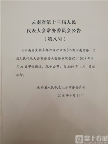 保护生物多样性,保障生态安全。10月16日,记者从云南省人民政府新闻办公室召开的新闻发布会上获悉,《云南省生物多样性保护条例》条例由省十三届人大常委会第五次会议2018年9月21日表决通过,自2019年1月1日起施行。成为全国率先出台生物多样性保护地方性法规的省区,标志着云南省生物多样性保护和管理进入规范化、法制化轨道。