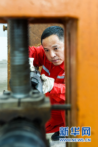 在中国石化江苏油田工程技术服务中心,田明在检查设备(10月9日摄)。新华社记者 李博 摄