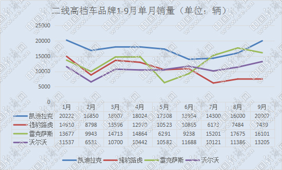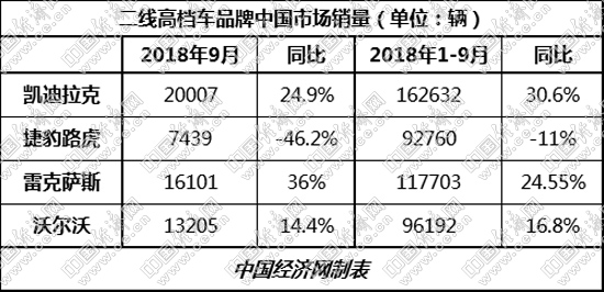 对整体低迷的乘用车市场,9月的二线高档车市,除捷豹路虎外其他三大品牌均实现两位数增长。其中,凯迪拉克在连续两月被雷克萨斯超越后,凭借XT4上市之后的不俗表现,再度夺得单月销冠,并实现了今年以来的第二次单月销量超两万辆。