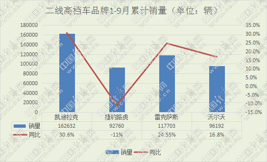 从前9月累计销量来看,二线高档车市场依然保持两极分化态势。稳固榜眼之位的雷克萨斯与凯迪拉克继续位居第一阵营;而销量仍不见起色的捷豹路虎则被沃尔沃超越,排名由第三位滑落至二线高档末尾。