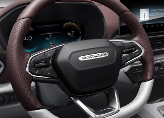 内饰方面,大量使用六边形元素塑造出很强的线条感。三辐式平底方向盘带有“BaoJun”字母元素。其它配置方面,全液晶仪表盘、大尺寸悬浮式中控屏幕以及下方的液晶空调显示面板形成三屏联动,整体科技感十足。