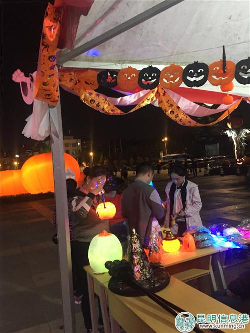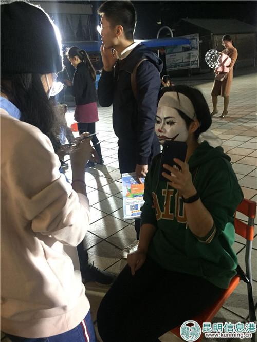 今晚的昆明世博园,在南瓜灯及哈喽喂音乐的营造下,处处弥漫着神秘气息。19:00在公园大门口,身着南瓜服的卡通人偶,随着热闹的音乐声欢乐热舞,也拉开了此次狂欢的序幕。除了热闹的开场活动,在园区内最吸引眼球的,莫过于彩绘哈喽喂妆容了,只需花10元—20元不等的费用,就可以用环保材料打造一个独一无二的特色妆容,难怪吸引了很多幼儿及女性游客争相体验。