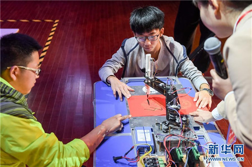 10月21日,在位于安徽合肥的中国科学技术大学,“3097”队带着狮子绣球组合机器人参加比赛。 新华社记者张端摄