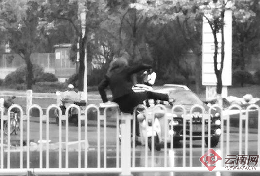 昨日上午11时许,记者在翠羽路和人民西路交叉口路段,看到一名在雨中不顾车流翻越隔离栏的女士。就在她刚翻过隔离栏进入翠羽路时,从翠羽路口刚好行驶出一辆右转车辆,此时从她右侧的来车也行至她身边,这名女士就被夹在了路中间,场面危险。