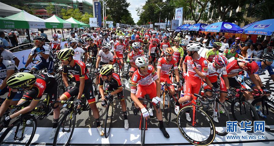 10月23日,车手在赛段起点准备出发。 当日,2018环海南岛国际公路自行车赛在海南儋州开赛。第一赛段为儋州绕圈赛,全程90公里。 新华社记者郭程摄