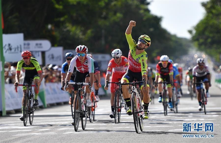10月23日,意大利威廉队车手马雷斯科(前)冲过终点后庆祝。 当日,2018环海南岛国际公路自行车赛开赛。第一赛段为儋州绕圈赛,全程90公里。最终,意大利威廉车队车手马雷斯科包揽赛段冠军、个人总成绩第一名和冲刺总积分冠军三个奖项。 新华社记者郭程摄