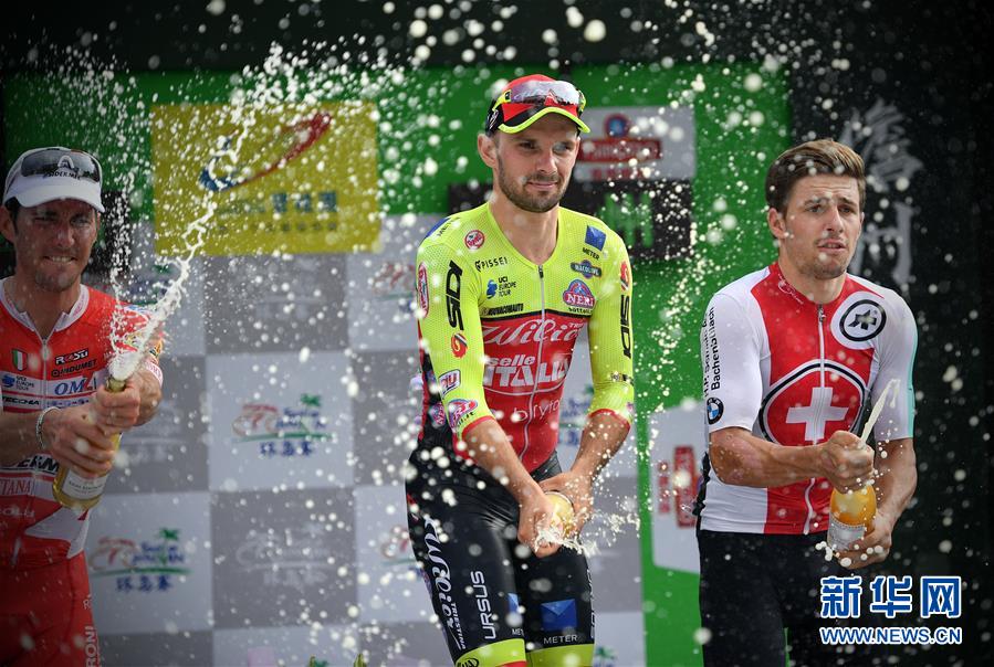 10月23日,意大利威廉队车手马雷斯科(中)在颁奖台上庆祝。 当日,2018环海南岛国际公路自行车赛开赛。第一赛段为儋州绕圈赛,全程90公里。最终,意大利威廉车队车手马雷斯科包揽赛段冠军、个人总成绩第一名和冲刺总积分冠军三个奖项。 新华社记者郭程摄