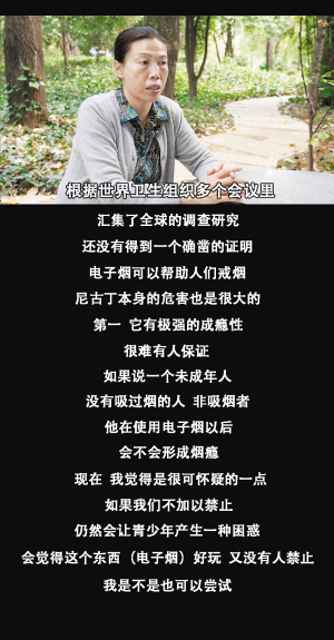 市民杜晓娅:“电子烟也是烟啊,也含有会让人上瘾的尼古丁,对身体依然会产生伤害。电子烟并不能成为戒烟的工具,只是换了一种抽烟方式而已。”