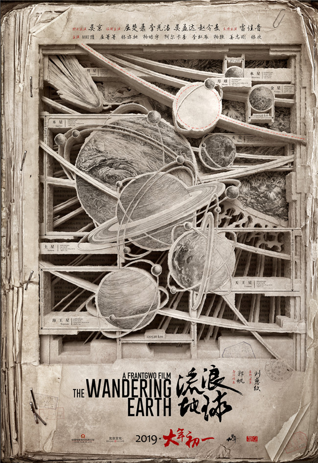 发布会上,导演郭帆、刘慈欣与吴京一起揭晓了《流浪地球》的首张全手绘概念海报。无论从色调还是图案上都可以感受到这张海报的复古气息,这是因为这张概念海报是站在未来的角度来制作设计的。海报上一本厚厚的书被“雕刻”成太阳系八大行星的图案。有意思的是,这个概念海报中,八大行星唯独不见地球踪影,从正面切题“流浪地球”,颇具巧思,也引发猜想。活动现场刘慈欣强调:地球没有消失,它像一艘宇宙飞船在宇宙中航行,这样的移动给整个人类的命运都带来了巨大变化。概念海报传达出影片将文字实现成影像的信息,让观众不禁期待,到底刘慈欣想象中的科幻世界呈现在大银幕上会带来怎样惊喜?