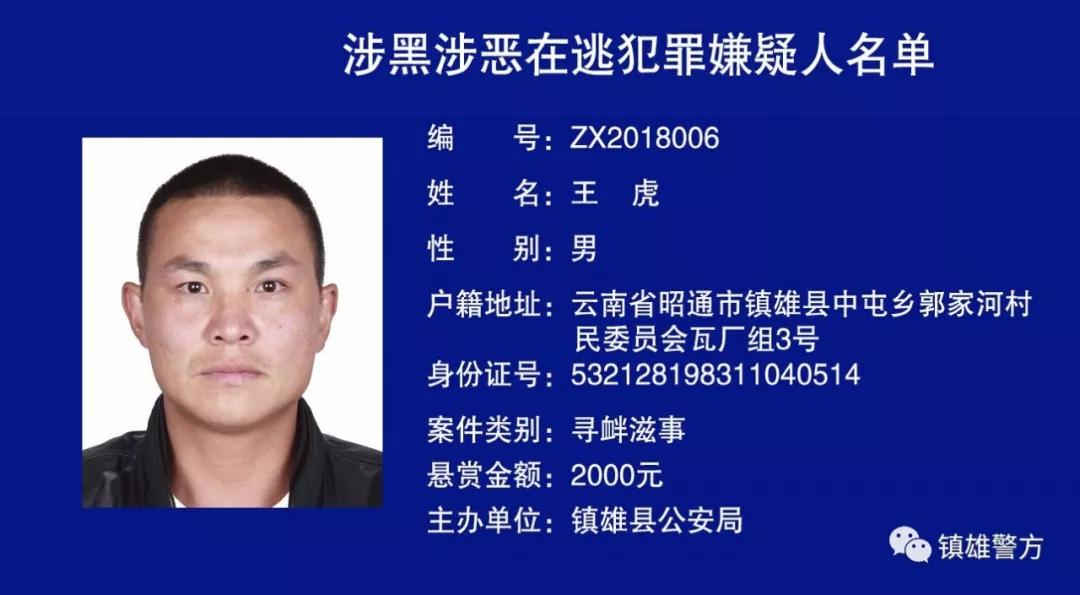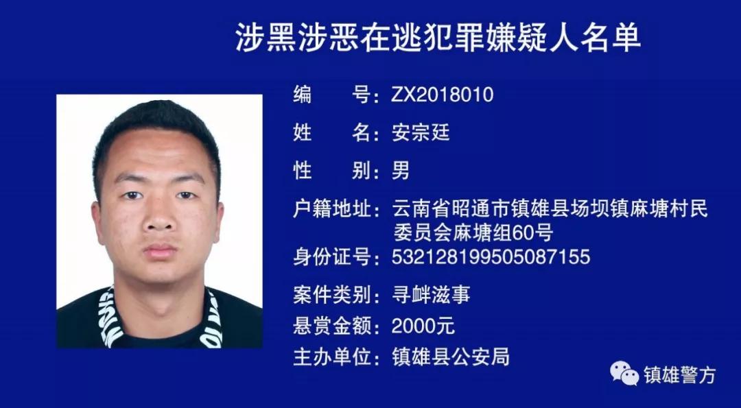 镇雄县公安局关于对涉黑涉恶在逃犯罪嫌疑人进行悬赏的通告