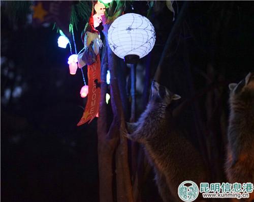夕阳西下,云南野生动物园的工作人员开始为园区内的浣熊家族做准备。为了营造好万圣节氛围,工作人员特意选择在没有游客的晚上给小动物们过节。当工作人员布置完现场后,天色已完全黑了下来。这时,原本在闭园时懒洋洋地小窝里打盹的小浣熊们却又一次焕发了活力。
