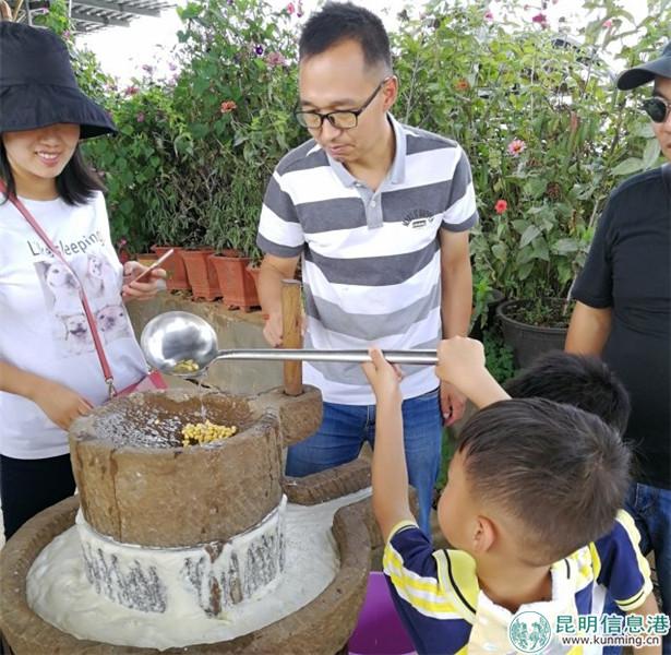 吃完中午饭后,大家又分成三组,学习舂饵块、磨豆浆、舂洋芋粑粑。活动中,不论是小朋友还是家长,都认真参与、体会尝试。
