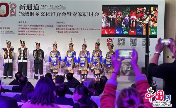 在富有特色的侗族琵琶歌开场的新通道•锦绣侗乡文化推介会暨专家研讨会上,通道县委常委、宣传部部长蔡迪文致辞中,希望借此次推介会打造通道旅游名片,创造更多的文化交流和商贸合作机会,促进社会创新与价值认同,协助怀化市委宣传部进一步促进侗族文创开发与发展。期间,十九大党代表、湖南省通道侗族自治县牙屯堡镇文坡村党支部书记粟田梅发言,感谢社会各界对侗族非遗文化的关注以及湖南大学设计艺术学院在这十年间通过设计帮助通道县脱贫所作出的努力。