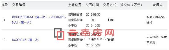方旺片区流拍地块编号为KCGD2018-8-A1、KCGD2018-9-A1,属城镇住宅用地,交易面积约65亩,起价87933.09万元。按计划,该批土地将于30日下午15时在昆明市土地和矿业权交易网进行拍卖。但在交易前一天,该批土地交易状态被修改为“已流拍”,原因是报名人数不足。其实按修改后的昆明土地拍卖规则,只要有1位竞买人报名,土地照样可以正常拍卖,这样来看方旺地块这次是无人问津了。