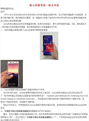 在这封题为《致小米雷军的一封公开信》的公告中,米界称,小米MIX3滑盖全面屏手机设计抄袭了米界于2017年oono全面屏IP战略发布会公开的上海全面屏创意,并发布了两款手机的对比图,表示“有图有真相”。