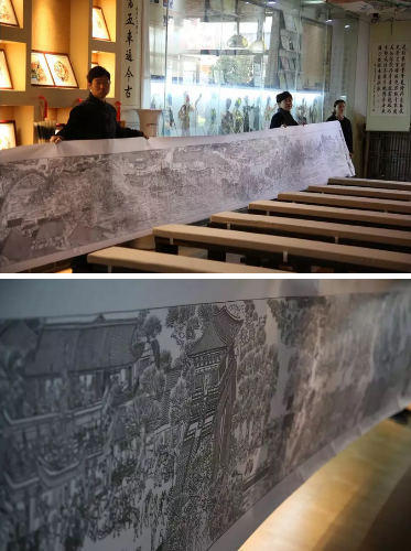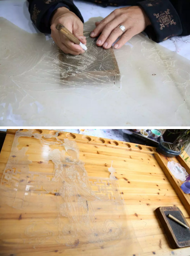 馆内,刘朝侃还向旅游达人们展示了正在制作中的“清明上河图”皮影画稿。据了解,这幅清明上河图需要十七张牛皮耗时一年半才能完成。刘朝侃说:“一张牛皮要经过硝皮、铲皮、打磨、着色、连接等多道工序,才能做成皮靠子,而且每个过程的细节都非常讲究,稍不注意就可能前功尽弃。着色的时候不能用水彩、国画颜料,一定要用矿物质颜料,这样色彩才能更持久、通透。”