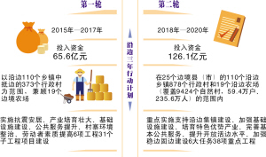 第二轮沿边三年行动计划实施期限为2018年—2020年,行动计划明确,力争到2020年,距国境线3公里以内的城镇功能更加完备,辐射带动能力进一步增强,成为边民就地就近创业和就业、产业发展和商品流通、守土固边和睦邻友好的支点;沿边建档立卡贫困户精准脱贫,农村常住居民人均可支配收入增幅达到全县平均水平,交通出行、饮水安全等基础设施进一步改善,特色产业促进就业和增收能力进一步增强,沿边乡镇所有行政村(社区)全部实现通路、通电、通水、通广播电视、通电话互联网“五通”;有合格村级组织活动场所、有合格卫生室和村医、有宜居生活环境、有抗震安居房、有高稳产农田地、有经济作物、有商品畜、有劳动技能“八有”;贫困发生率下降到一个较低水平、农村常住居民人均可支配收入达到或超过所在县市平均水平、基本公共服务水平达到或超过所在县市平均水平“三达到”。