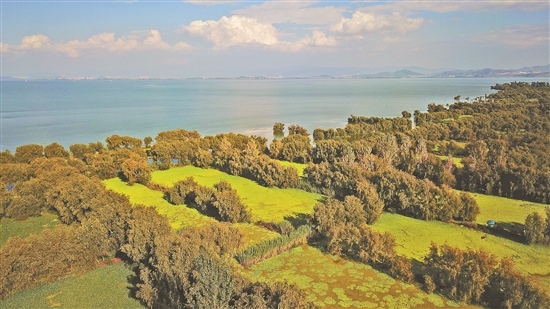 南滇池湿地公园位于滇池西南角晋宁昆阳街道办事处,距昆明主城50余公里。南滇池湿地生态系统保存较完整,生物多样性丰富,共分布有植物226种、脊椎动物168种、两栖爬行类20种、鸟类127种,成为滇池湖滨野生动植物品种和数量最为丰富的区域之一,在滇池水生态安全维持和生物多样性保育中发挥着重要作用,有着极高的保护价值和科学研究价值。湿地公园建成开放后,慢行步道等配套设施为市民提供亲水、近水空间,吸引了广大市民游玩参观,增近了与自然的亲切感。图为湿地一景。