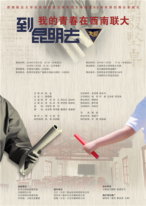 原创舞台剧《到昆明去——我的青春在西南联大》,由中国话剧金狮奖导演、中央戏剧学院导演系副教授黄凯担任导演,多位资深编剧联合撰写,历经近三年的精心筹备,旨在向在战争困境中成就教育伟业的西南联合大学致敬,向西南联合大学在昆建校暨云南师范大学建校八十周年献礼。