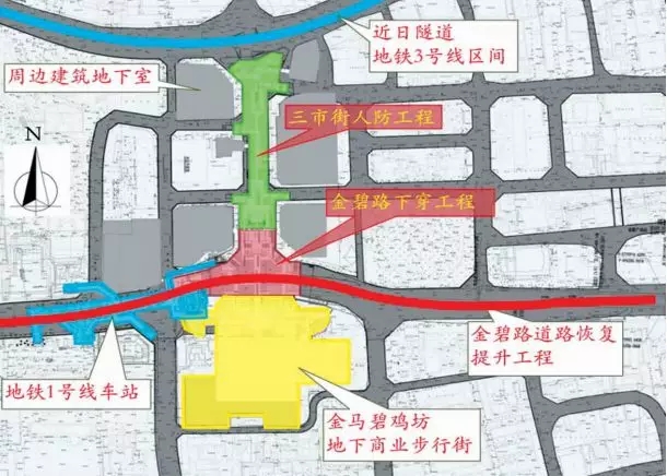 A:三市街人防工程与地铁1号线西北延金碧广场站工程和金碧人行下穿工程同期施工。工程通过金碧人行下穿工程与地铁1号线西北延金碧广场站无缝连接,地铁乘客在站厅层出站后,可通过金碧人行下穿工程直接到达三市街人防工程。