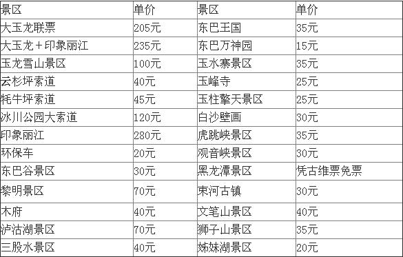 同时景区景点门票(单人价格)的参考价也有提及。其中一些景区景点单人价格为:大玉龙联票205元(该票票含玉龙雪山景区、东巴谷景区、东巴王国景区、东巴万神园景区、玉水寨景区、玉峰寺、玉柱擎天景区、白沙壁画),大玉龙+印象丽江235元,玉龙雪山景区100元,印象丽江280元,冰川公园大索道120元,东巴谷景区30元,黎明景区70元,木府40元,泸沽湖景区70元,虎跳峡景区35元,白沙壁画30元,束河古镇30元,文笔山景区40元。