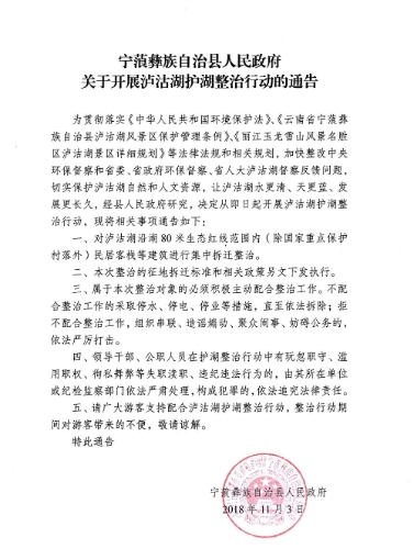 为了让泸沽湖水更清、天更蓝、发展更长久,11月3日,云南省丽江市宁蒗彝族自治县人民政府发布《宁蒗彝族自治县人民政府关于开展泸沽湖整治行动的通告》(以下简称《通告》),通告称:即日起对泸沽湖沿湖80米生态红线范围内的民居客栈等建筑进行集中拆迁整治,不配合整治工作的将采取停水、停电、停业等措施,直至依法拆除。
