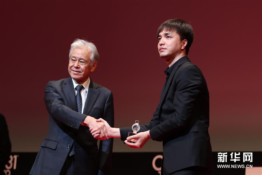 11月2日,在第31届东京国际电影节颁奖典礼上,中国导演黄璜(右)在作品《武林孤儿》获“亚洲未来”单元国际交流基金亚洲中心特别奖后上台领奖。新华社记者杜潇逸/摄