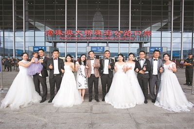 六对建设者夫妻回港珠澳大桥珠海公路口岸补拍婚纱照。