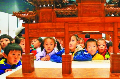 近日,“榫卯的魅力”主题展览在中国科技馆开展,观众可在看展时亲手拆装各种榫卯模型。展览将持续至2019年1月10日。图为一群小观众在欣赏建筑榫卯模型。