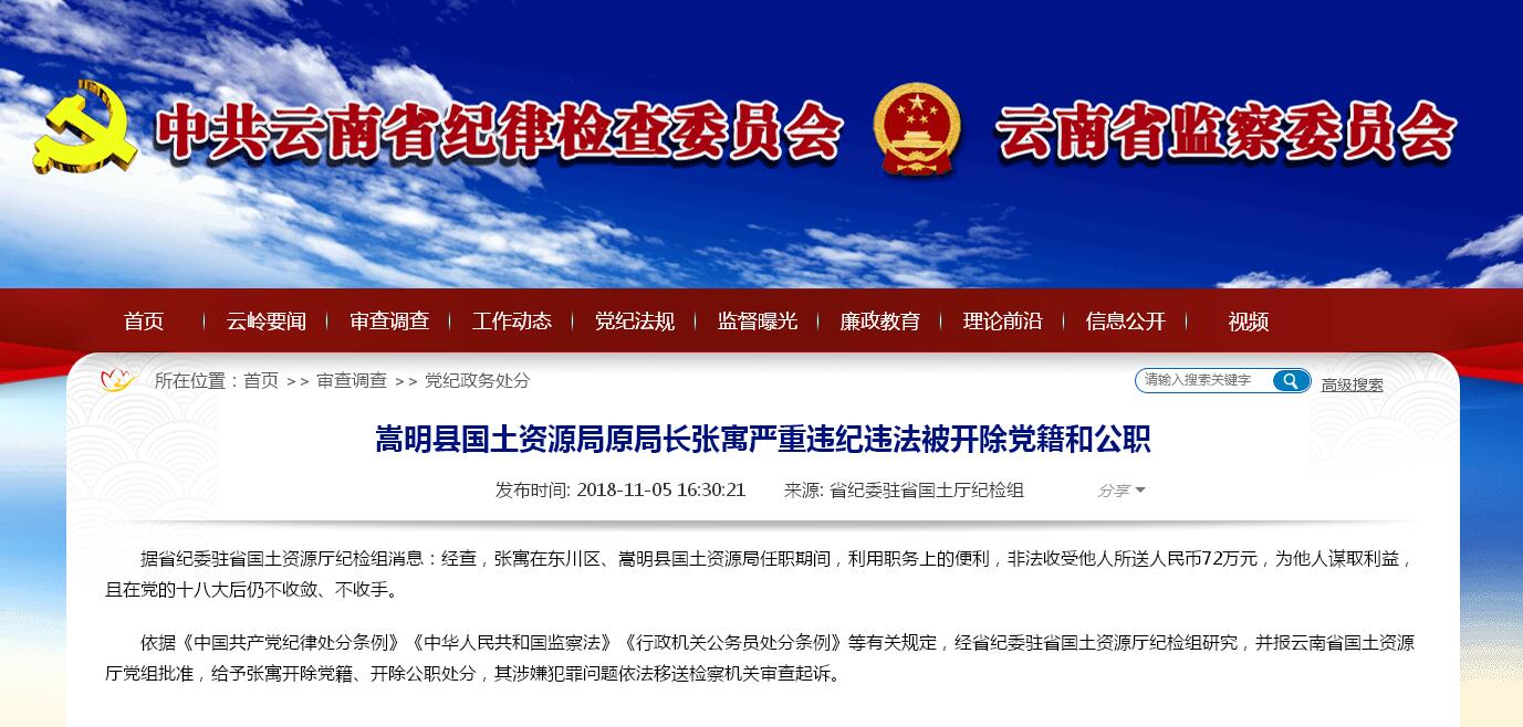 依据《中国共产党纪律处分条例》《中华人民共和国监察法》《行政机关公务员处分条例》等有关规定,经省纪委驻省国土资源厅纪检组研究,并报云南省国土资源厅党组批准,给予张寓开除党籍、开除公职处分,其涉嫌犯罪问题依法移送检察机关审查起诉。