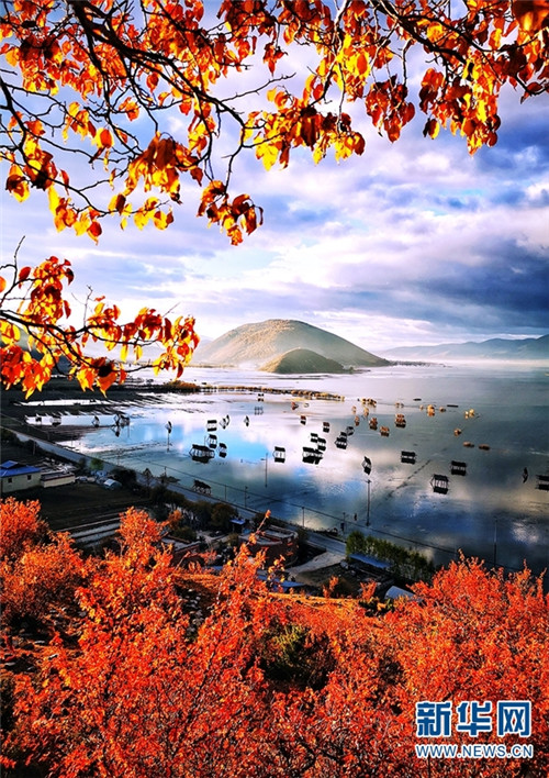 云蒸霞蔚,水光潋滟,如油画般美丽的纳帕海秋景。(新华网 崔永江/摄 念新洪/文)