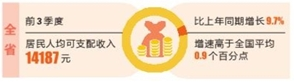 前3季度,全省城镇常住居民人均可支配收入24742元,增长8.3%,增速高于全国平均0.4个百分点。全省农村常住居民人均可支配收入7046元,增长9.2%,增速高于全国平均0.3个百分点。