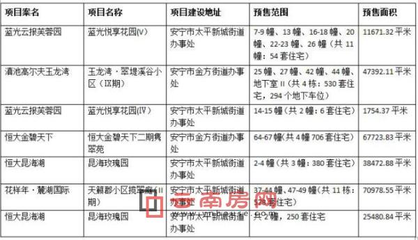 根据安宁政府网站发布的《商品房预售许可证》的公示信息来看,上周太平新城共有蓝光云报芙蓉园、滇池高尔夫玉龙湾、恒大金碧天下、恒大昆海湖、花样年麓湖国际5个项目获得预售证,为太平市场新增预售面积263473.9平米,其中恒大昆海湖、蓝光云报芙蓉园两个项目分别获得两张预售证,新增预售63953.72平米和13425.69平米,花样年麓湖国际一次性新增预售70978.55平米,为市场供应578套住宅,是此次新增预售面积最多的项目。