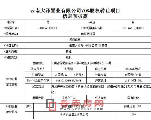 日前,云南省产权交易所发布了云南大泽置业有限公司股权转让预披露公告,股权转让公告显示,云南大泽置业成立于今年6月,注册地位于阳宗海风景名胜区,是云南大业置业有限公司旗下控股的全资子公司,属于国有控股企业。此次股权转让,云南大业置业拟转让持有的云南大泽置业70%股权,转让后云南大业置业将不再是大泽置业的控股股东。