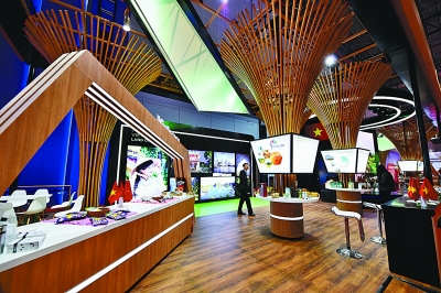 越南展厅是让人近距离了解越南的窗口。走进越南展厅,明艳的奥黛率先在观众眼底留下一抹亮色;驻足体会,滴漏咖啡肆意飘散香气,醇美鲜香的腰果余味绵绵;仔细寻找,香米、糯米、红米一应俱全,桂皮、八角、胡椒样样不少,燕窝、蜂蜜、椰丝令人爱不释手……在256平方米的越南展厅里,每种味道都在向人解释着什么叫作“一根扁担挑着两筐稻谷”——“一根扁担”指的是越南中部的狭长地带,“两筐稻谷”则是指红河平原和湄公河平原这两个著名的“粮仓”。人们用这句话来赞美越南物产资源的丰富。