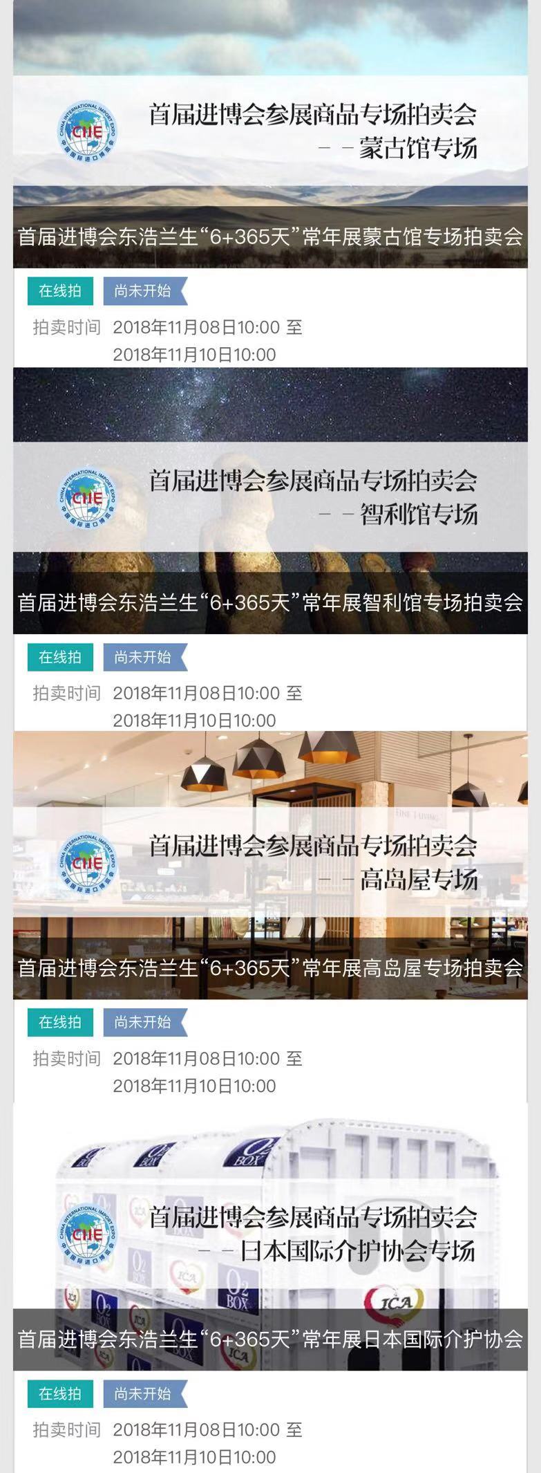 首批亮相国拍网拍平台的四场进博会参展商品专场拍卖会,分别为蒙古馆专场、智利馆专场、高岛屋专场及日本国际介护协会专场,共精选拍品50余件。上海国拍还为每位买受人精心制作了参与首场进博会参展商品网络拍卖的纪念证书。