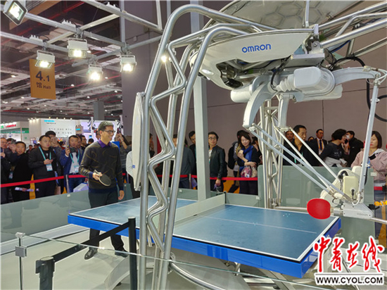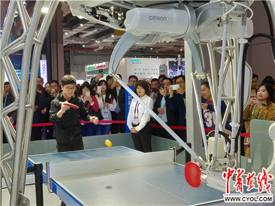 在高端装备和智能制造展区,欧姆龙公司的展台边,有许多观众在排队,等待与会打乒乓球的智能机器人“FORPHEUS”一较高下。其中不少观众败于这个机器人的球拍之下。