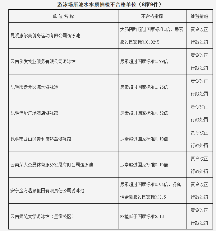 水质抽检不合格的8家游泳场所中有7家尿素超标,其中云南俊发物业服务有限公司游泳馆的尿素超过国家标准1.99倍。另外,昆明康尔美健身运动有限公司游泳池的大肠菌群超过国家标准1倍,安宁金方温泉假日有限责任公司游泳池的游离性余氯超过国家标准3.5倍,云南师范大学游泳馆(呈贡校区)PH值低于国家标准2.13。