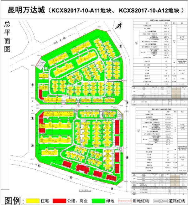 据公示,昆明融创万达文化旅游城A11和A12地块的申报单位为昆明万达城投资有限公司,A11地块的项目性质为住宅,净用地面积约68.53亩,总建筑面积约9.78万方,其中,地上建筑面积约5.04万方(计容面积约5.03万方,不计容面积约150.92平方米),地下建筑面积约4.74万方。地块的容积率为1.10,建筑密度为30.0%,绿地率为40.0%,用地内规划布局7栋洋房和22栋低层住宅,共计容纳287户,配建机动车车位和非机动车车位各504个。