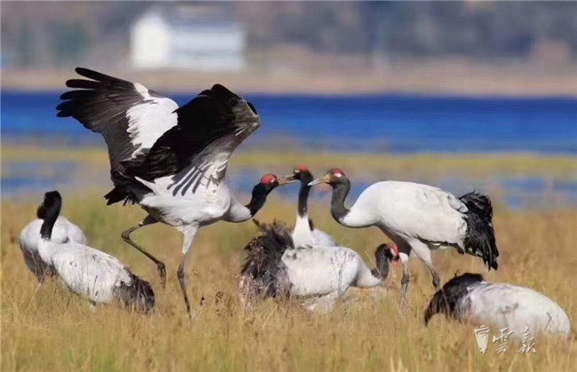 记者在大山包黑颈鹤国家级自然保护区看到,1000多只黑颈鹤或翩翩起舞、或引喉高歌,这些“高原舞者”比往年来得更早、更集中、数量更多,它们将在这里越冬栖息200多天。