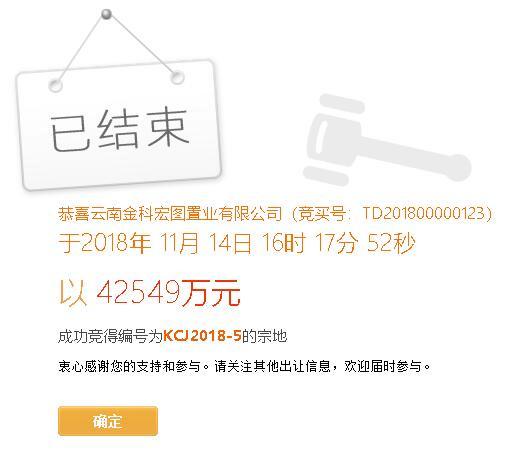 截止到报名时间,经开区拍卖地块共有6位竞买人报名。在经过48轮激烈竞价后,云南金科宏图置业有限公司成功击败其它5个对手,以42549万元的价格竞得土地。土地溢价率达52%,土地单价约395万元/亩,楼面价约2371.6元/平米。据知情人士透露,今日参与土地拍卖的还有阳光城、旭辉、平安、中南几家房企。