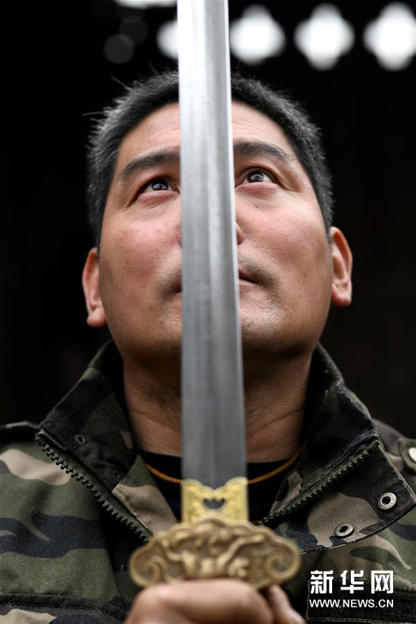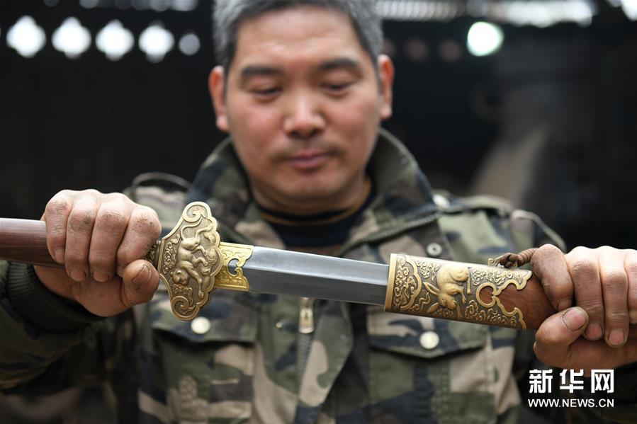 11月14日,在石家庄市行唐县铁匠庄村,李住军在工作室展示工艺剑成品。 河北省石家庄市行唐县铁匠庄村以打铁远近闻名,几百年来,这门技艺在铁匠庄村传承不绝。 今年47岁的李住军是村里的代表性打铁匠人,他师承父亲,凭着对传统技艺的热爱,钻研摸索十余载,掌握了百炼花纹钢锻造技艺,他所掌握的传统工艺剑锻造技艺被评为石家庄市级非物质文化遗产。 近年来,李住军坚持创新,打造出蚕丝纹、流水纹等十余种精美花纹图案,这种经反复折叠锻打而在表面上所浮现的肌理纹路,增强了工艺剑美感,提升了工艺品质,成为当地一张独特的非遗文化名片。 新华社发(陈其保摄)