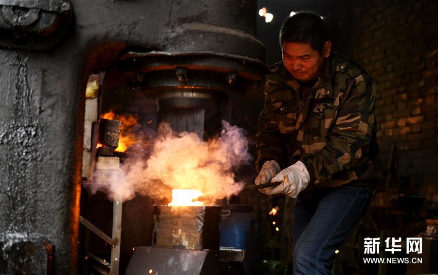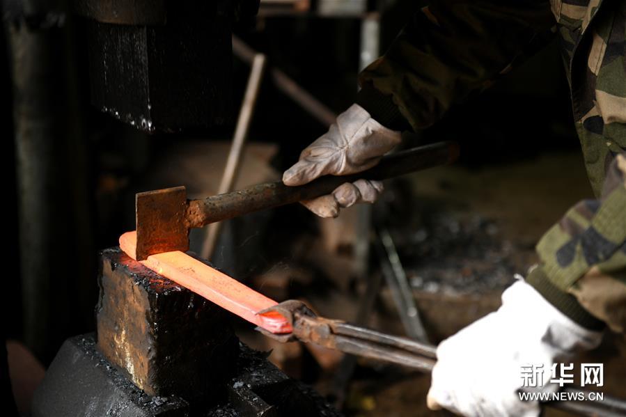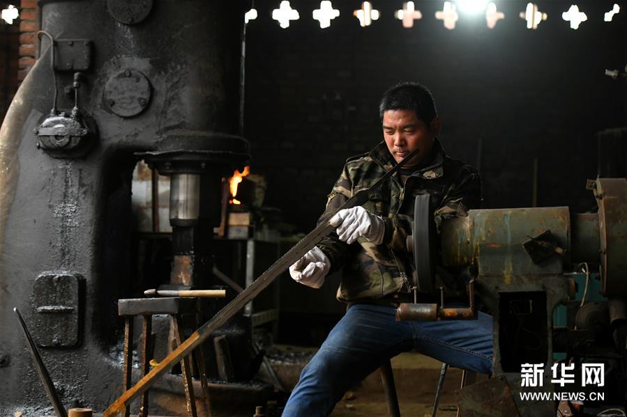 11月14日,在石家庄市行唐县铁匠庄村,李住军在工作室制作传统工艺剑。 河北省石家庄市行唐县铁匠庄村以打铁远近闻名,几百年来,这门技艺在铁匠庄村传承不绝。 今年47岁的李住军是村里的代表性打铁匠人,他师承父亲,凭着对传统技艺的热爱,钻研摸索十余载,掌握了百炼花纹钢锻造技艺,他所掌握的传统工艺剑锻造技艺被评为石家庄市级非物质文化遗产。 近年来,李住军坚持创新,打造出蚕丝纹、流水纹等十余种精美花纹图案,这种经反复折叠锻打而在表面上所浮现的肌理纹路,增强了工艺剑美感,提升了工艺品质,成为当地一张独特的非遗文化名片。 新华社发(陈其保摄)