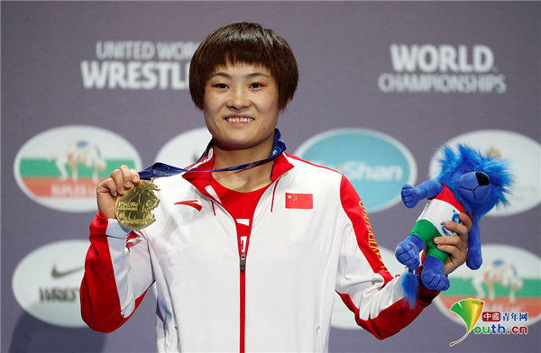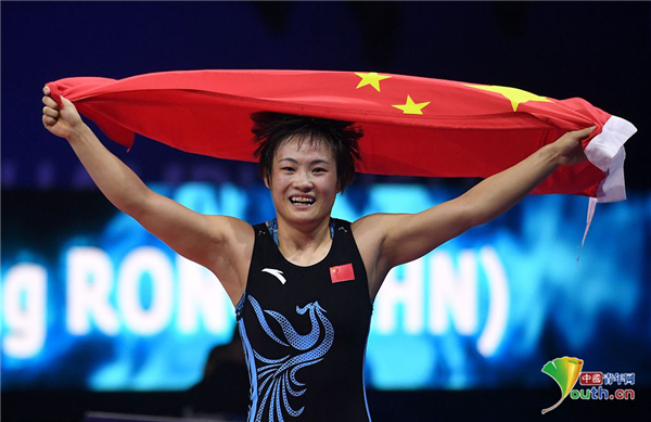 2018年世界摔跤锦标赛中,中国选手荣宁宁在女子自由式摔跤57公斤级的比赛中夺得金牌。资料图