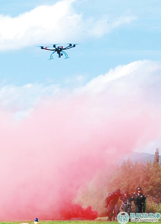 居民楼顶层突发火灾,有人被困。一架无人机快速精准地飞抵火源附近,悬停在半空,将一枚灭火弹从窗口平射进屋内,随着 “嘭” 的一声,屋内腾起一股白烟,明火被控制。随后,另一架无人机快速将救援绳索及逃生手册打包送入楼内,被困人员得以逃脱。这是昆明市公安局警航支队昨日开展的“无人机高层灭火救援”演练,对于一些高层建筑物的火灾,现有的消防云梯难以抵达,而运用无人机,可快速靠近火源,在火灾发生初期迅速控制火情。