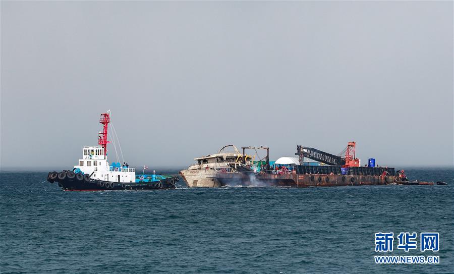 11月18日,在普吉岛附近海域,工作人员将打捞出水的“凤凰”号游船拖离事发水域,转移上岸。