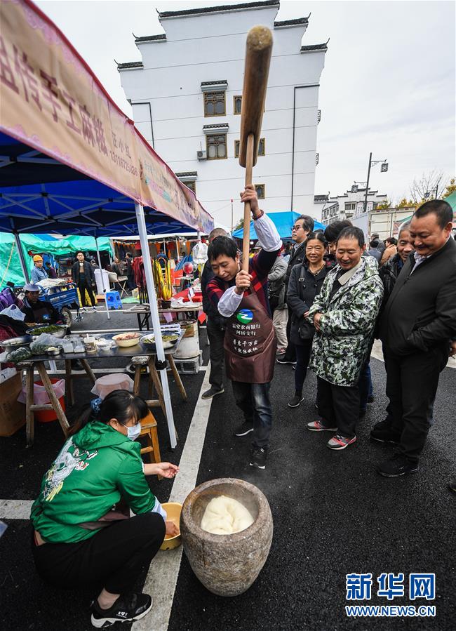 11月19日,商户在庙会现场展示传统打年糕。 当日,浙江省杭州市临安区河桥镇举办一场集传统文化展示、民俗表演、美食品鉴等于一体的传统庙会,吸引了众多游客和当地居民前来感受热闹气氛。 河桥古镇距今已有一千三百余年历史。本次河桥古镇通过举办传统庙会活动,展现当地悠久的民俗文化风情,营造古镇良好的文化氛围,树立河桥文化旅游品牌形象,提升知名度,助推当地乡村旅游发展。新华社 记者徐昱/摄