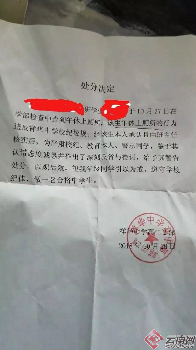 11月18日,有网友报料称,云南大理祥华中学一学生因午休上厕所被学校警告处分,并配发了一张加盖单位公章的“处分决定”。此信息经网络传播后引发大量关注和热议,多名网友对学校“午休不能上厕所”这一规定提出质疑,并称“尿急,肚子不舒服难道憋着吗?”、“这学校有病吧”、“不知道长期憋尿伤身体吗?”。